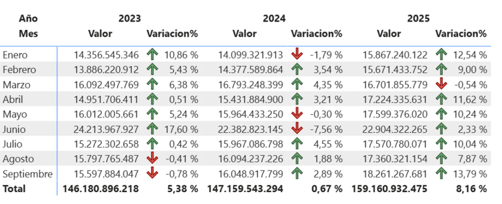 Además de la liquidez, las ventas totales y exportaciones (empresas y personas) también presentan rebote en periodo enero-septiembre 2025 (ultima data disponible) con crecimiento YTD 8.2% comparado con 0.7% en mismo periodo 2024. Esta información la tenemos desagregada actividad económica y ciudad – más de 1000 actividades.