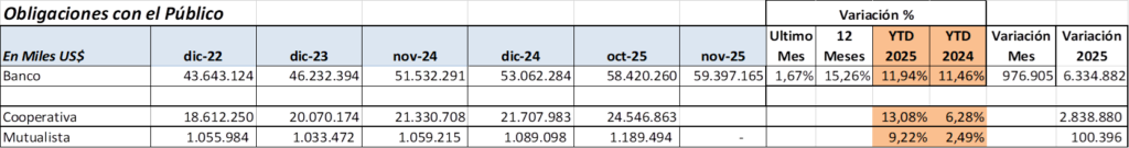 Noviembre presenta un importante crecimiento en depósitos de US$ 977 millones que representa aumento de 1.7% comparado con octubre 2025. Esta variación es la segunda mejor en 2025, seguramente impulsada por las ventas de Black Friday que estuvieron positivas (retail estima crecimiento de 15%) y el pago de decimo tercer sueldo en sector público y algunas del sector privado.