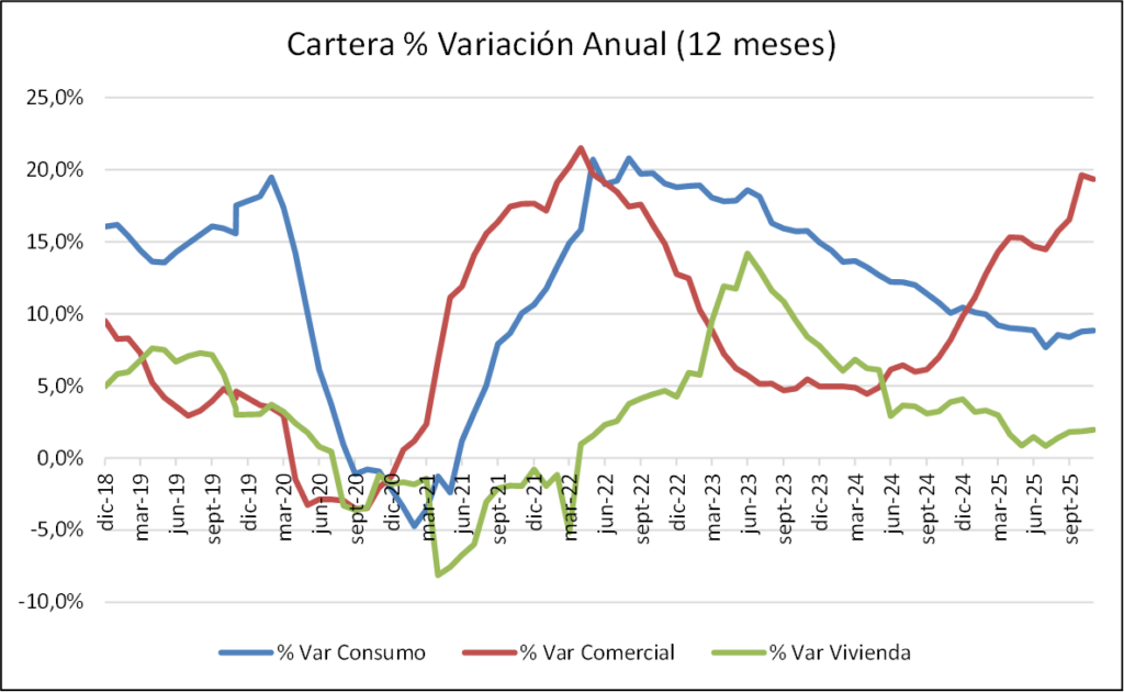 Es importante destacar que mientras la cartera de Consumo crece menos en 2025 que en 2024 (sobreendeudamiento de los hogares y tarjetas de crédito), la Comercial por el contrario crece más del doble en 2025.