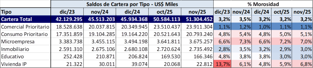 La cartera presenta el segundo mejor mes de crecimiento en 2025, sube $720 millones en noviembre que representa 1.4% de crecimiento mensual.