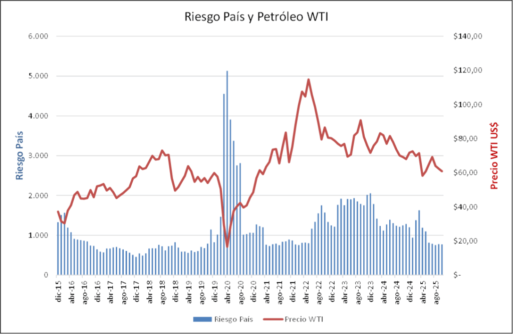 El riesgo país Ecuador mantiene su tendencia a la baja, cerrando septiembre en 777 puntos (durante septiembre llegó a estar por debajo de 700 puntos, y luego sube por las movilizaciones indígenas), y YTD 2025 presenta mejora de 36%, mientras que el precio WTI muestra tendencia a la baja en 2025, con caída de 15%.
