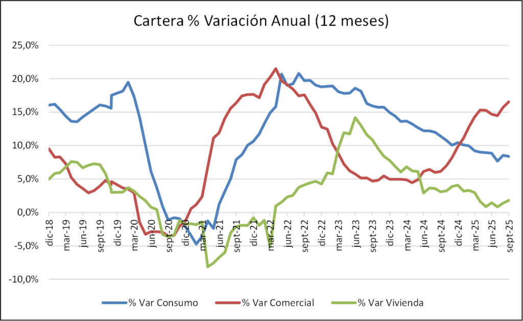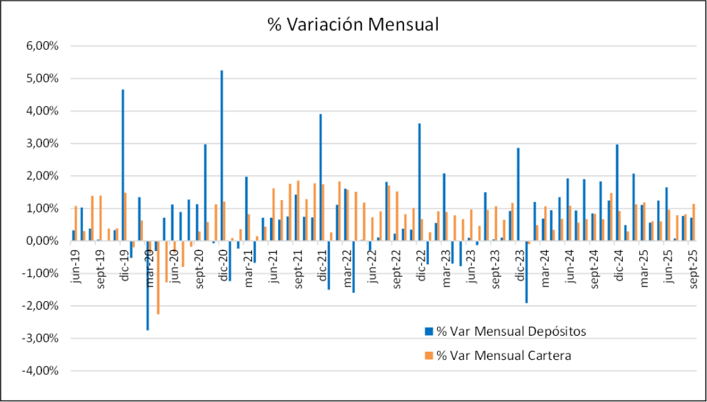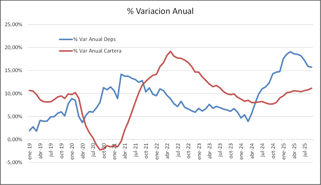 La liquidez se mantiene en alza, con recuperación de depósitos que crecieron 0.7% en septiembre, al igual que la cartera, siendo cartera Productiva / Comercial la de mejor desempeño con 11.4% en 2025.