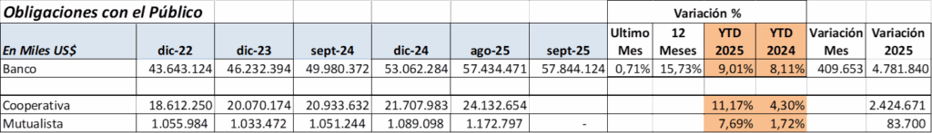 Los depósitos crecieron US$ 410 millones en septiembre 2025, representa 0.7% mensual, y aumento 15.7% anual.