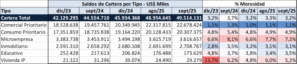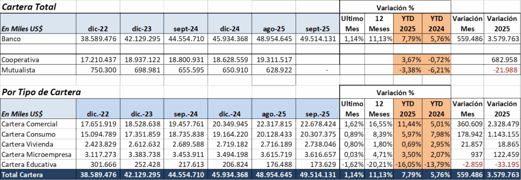 La cartera mantiene su ritmo de crecimiento, siendo septiembre el segundo mejor mes de crecimiento en 2025, con 1.14% mensual, US$ 560 millones.